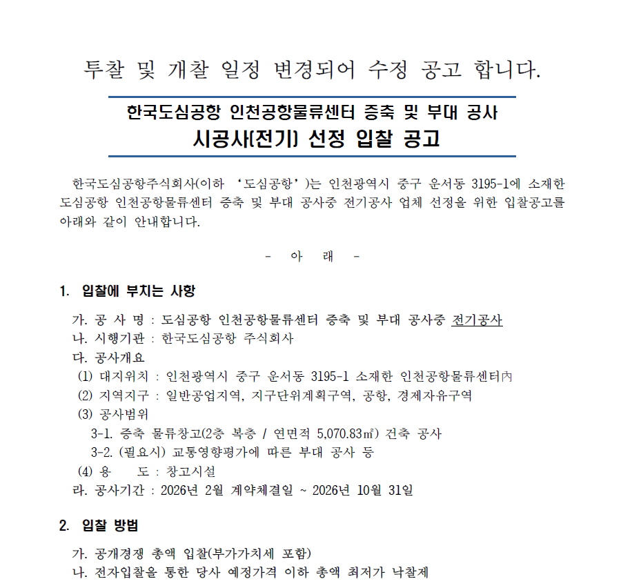 한국도심공항 인천공항물류센터 증축 및 부대 공사 시공사(전기) 선정 입찰 공고 (일정 2차변경)