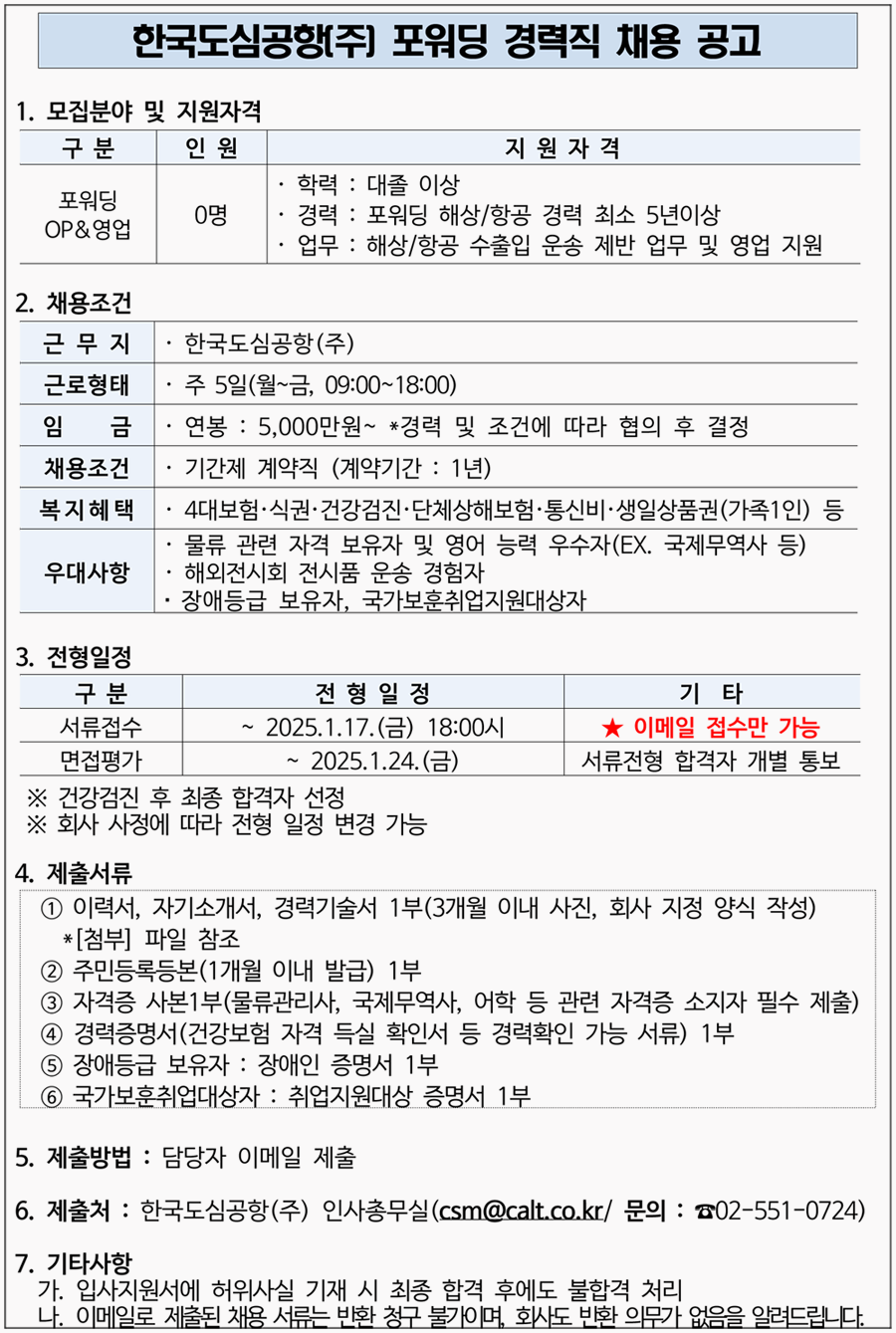 한국도심공항(주) 포워딩 경력직 채용 공고