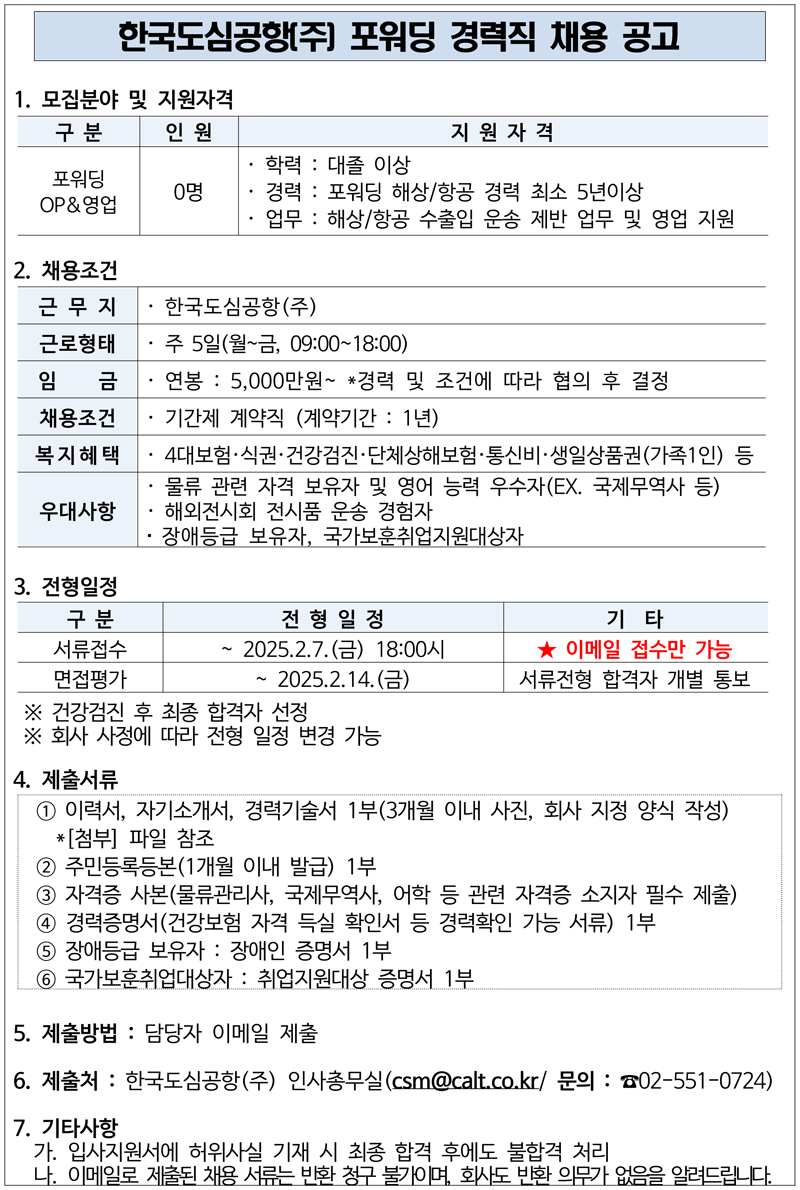 한국도심공항(주) 포워딩 경력직 채용 연장 공고