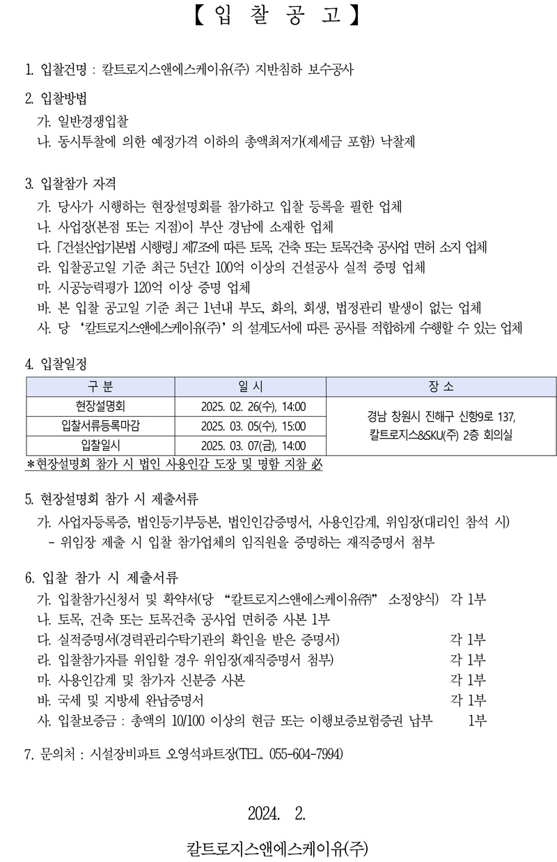 | 파일첨부 : 2. 입찰안내서.pdf 3. 입찰자유의서.pdf 6. 칼트로지스&SKU 지반침하 보수공사 공내역서.xlsx 4. 칼트로지스&SKU 지반침하 보수공사 실시설계도면.pdf | |