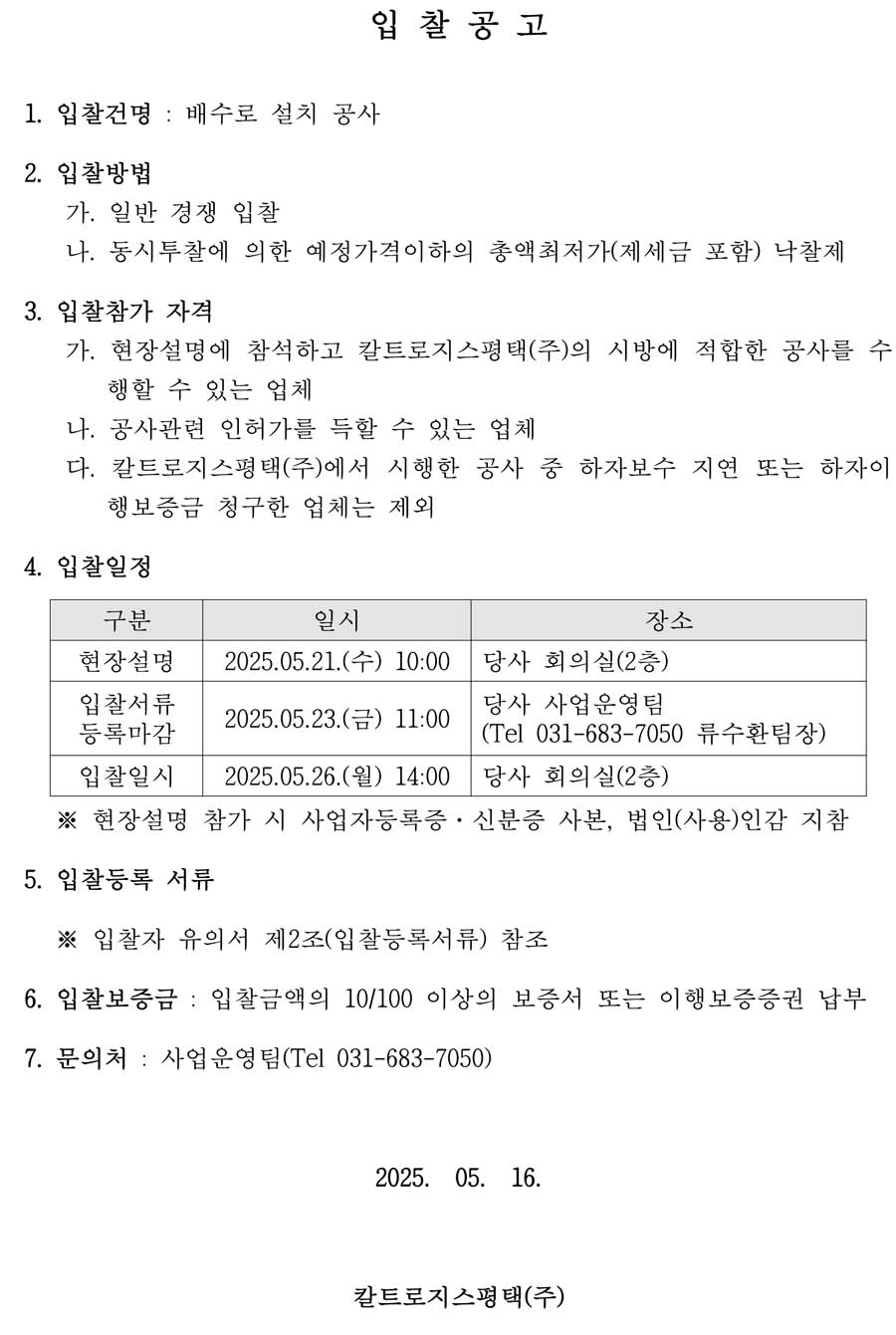 칼트로지스평택(주) 배수로 설치 공사 입찰 공고