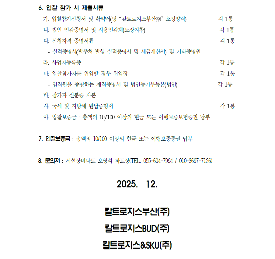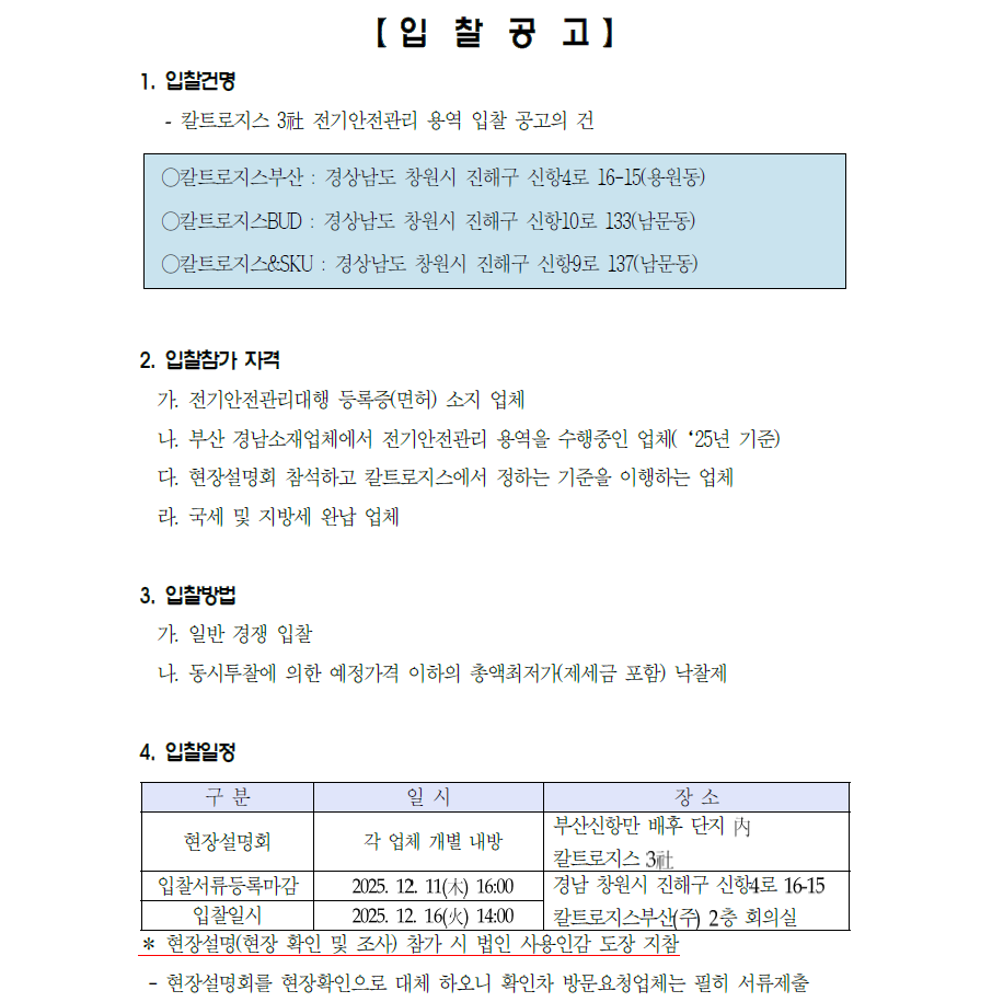 칼트로지스 3社 전기안전관리 용역 입찰 공고의 건