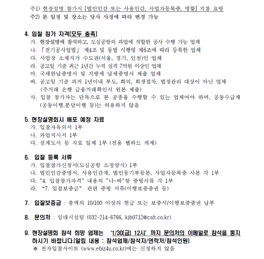 한국도심공항 인천공항물류센터 증축 및 부대 공사 시공사(전기) 선정 입찰 공고 (일정 2차변경)