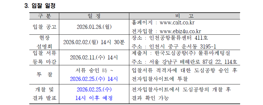 한국도심공항 인천공항물류센터 증축 및 부대 공사 시공사(소방) 선정 입찰 공고 (일정 2차변경)