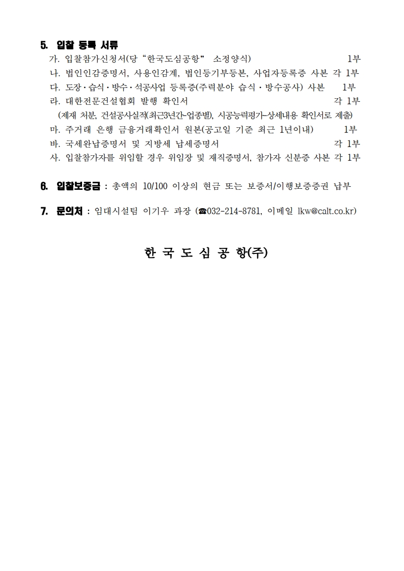 한국도심공항 인천공항물류센터 증축 및 부대 공사 시공사(전기) 선정 입찰 공고 (일정 2차변경)